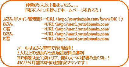 仲間が5人集まったらこちらがお得! 一つのオリジナルドメインを皆さんでお使い頂く新しいプランです! |